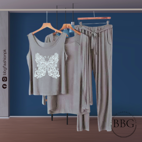 Inform when this item available Grey White Butterfly Women Night Suit PJ 3 Pieces Set