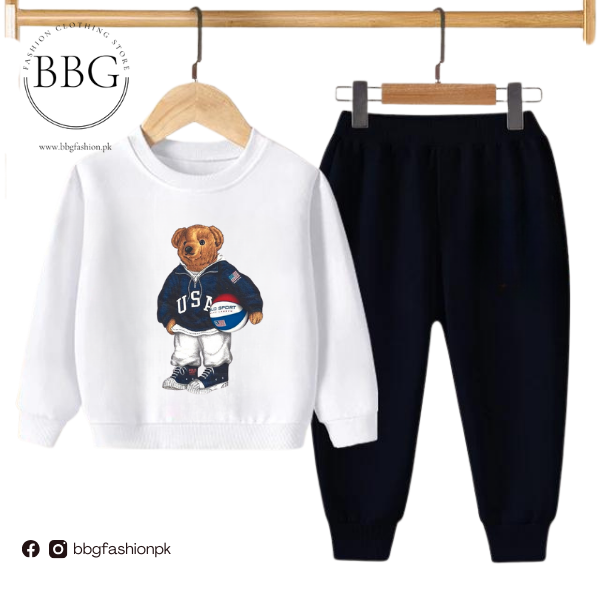 This Kids Sweatshirt & Pant is perfect for your little one's winter wardrobe! Crafted from breathable knitted Fleece Fabric, this two-piece set features a "Bear" print on the front of the sweatshirt, and the trousers feature a print on the left leg. Soft and stretchy, this outfit is perfect for everyday wear, keeping your little one warm and comfortable all winter long.