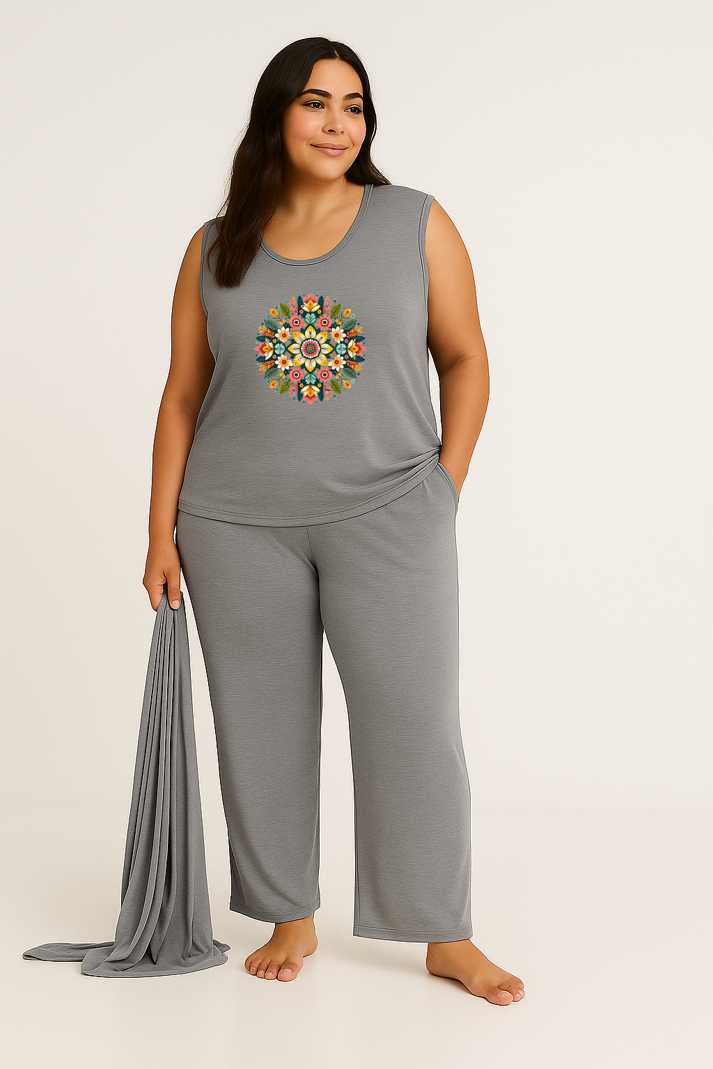 Women’s 3 Piece Nightwear Lounge Set with Multi Pattern Print | Plus Size Loungewear - Medium / Soft Jersey / Grey